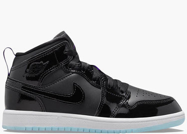 Le Nike Air Jordan 1 Mid Space Jam (PS) presentano una base in pelle nera arricchita da inserti in pelle verniciata e linguette in mesh. Il branding sulla linguetta e le solette in tonalità Dark Concord aggiungono un tocco distintivo, mentre l’intersuola bianca e la suola traslucida effetto ghiaccio completano il design con stile.