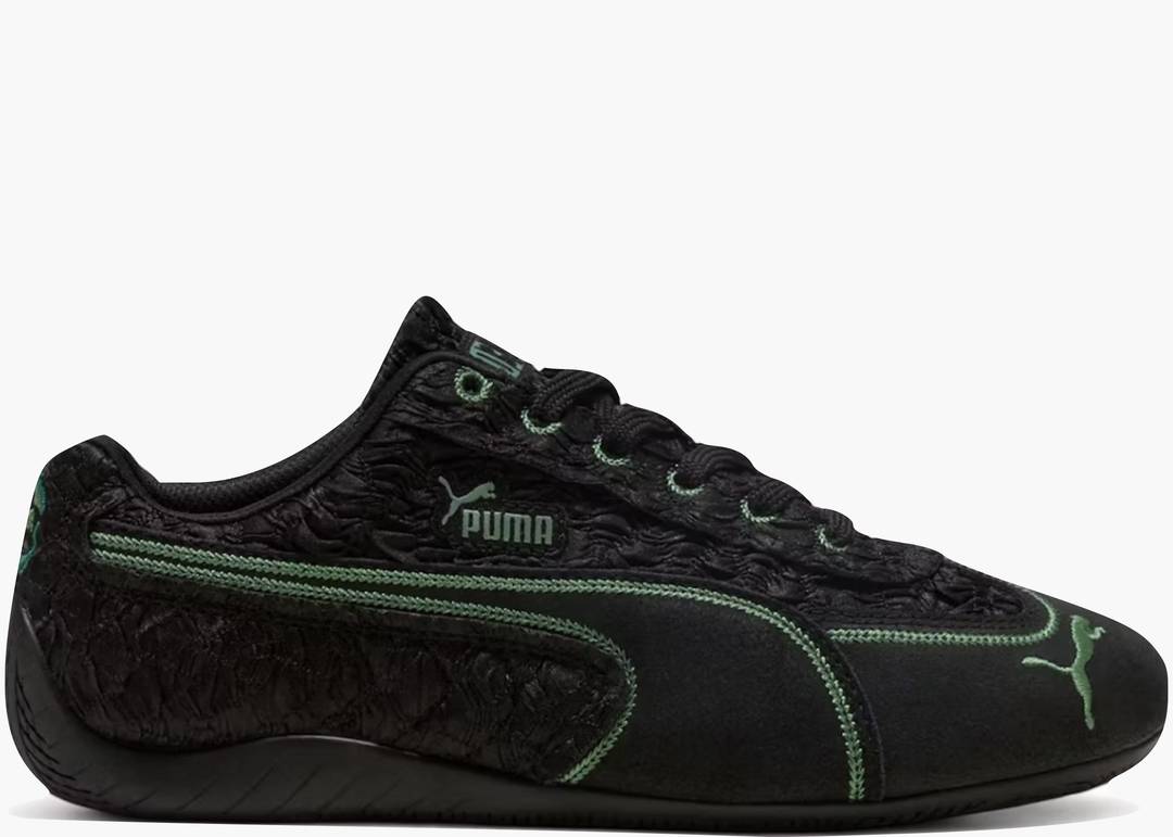 La Puma Speedcat Wicked Elphie (W) celebra l'iconografia del celebre musical attraverso un design che cattura l'essenza ribelle di Elphaba. La tomaia nera richiama l'estetica gotica del personaggio, arricchita da volant tridimensionali che aggiungono movimento e profondità. Le cuciture in lamina verde elettrico creano un contrasto cromatico audace e inconfondibile, simbolo della magia e della determinazione dell'antieroina. L'etichetta sulla linguetta con la scritta "Wicked" introduce un elemento narrativo che trasforma la sneaker in un tributo autentico al musical pluripremiato. Una calzatura che fonde performance sportiva e storytelling teatrale, perfetta per chi desidera esprimere personalità non convenzionale attraverso lo stile.