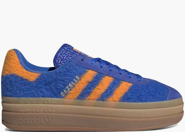 Le Adidas Gazelle Bold Hi-Res Blue Bright Orange (W) reinterpretano il classico modello Gazelle degli anni ’70 con una tomaia in tessuto effetto peluche blu che conferisce una texture unica. Le iconiche tre strisce arancioni creano un contrasto vivace, mentre la scritta "Gazelle" valorizza lo stile distintivo. La suola platform a triplo strato aggiunge altezza e un tocco moderno, combinando heritage e innovazione per un design versatile e contemporaneo.