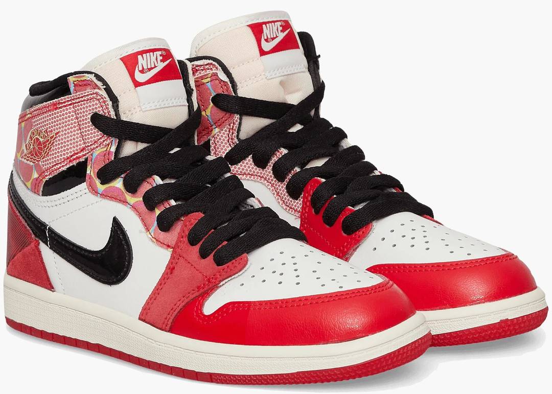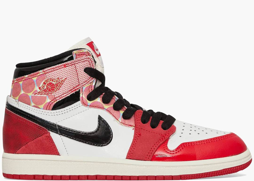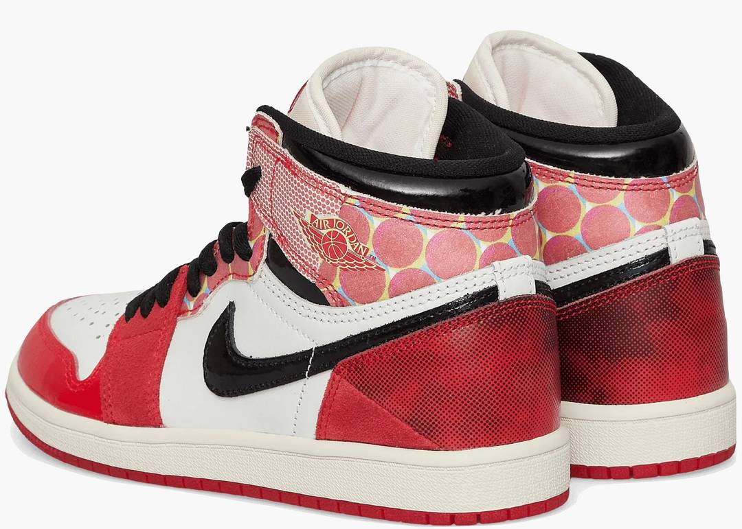 La Nike Air Jordan 1 High OG Spider-Man (PS) adotta una colorazione ispirata allo stile "Chicago", con tonalità University Red, nero e bianco. Il design incorpora sfumature accese e motivi geometrici che richiamano i viaggi di Miles Morales attraverso il multiverso. Il look è completato da dettagli in pelle verniciata nera su Swoosh e colletto, oltre a una suola rossa semitrasparente. Le sneaker verranno distribuite in confezioni speciali co-branded e saranno disponibili in misure per tutta la famiglia.