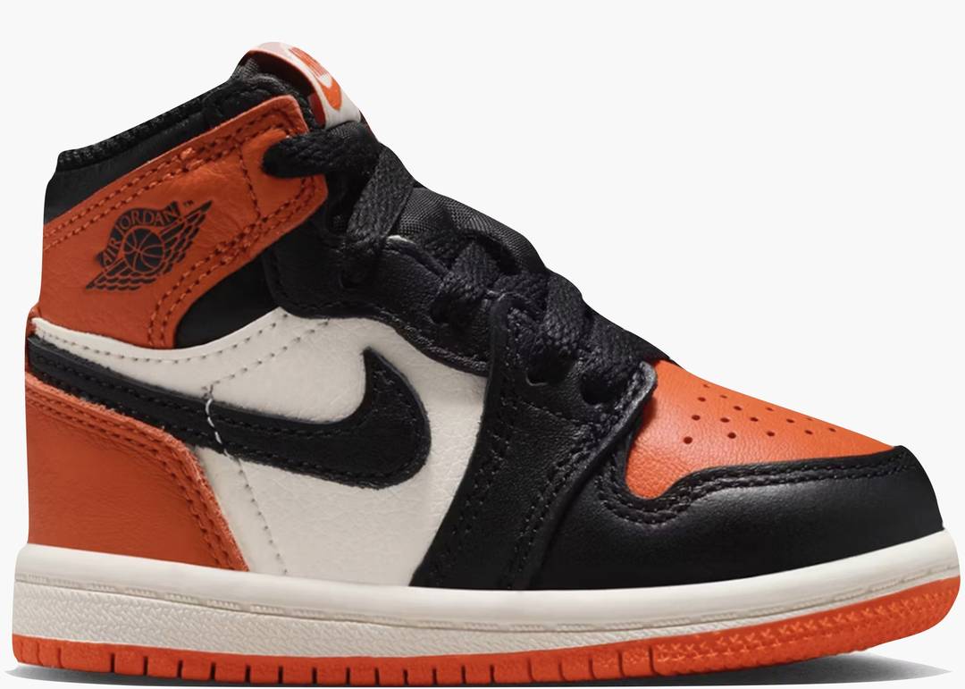 La Nike Air Jordan 1 Retro High OG Shattered Backboard (2025) (TD) rende omaggio alla celebre schiacciata di Michael Jordan che ruppe il tabellone in Italia. Ispirata alla maglia Stefanel Trieste di MJ, questa versione per i più piccoli presenta una tomaia in pelle martellata con una combinazione di nero, arancione e bianco sporco. Le solette sfoggiano una grafica di vetri frantumati, completando un design storico e distintivo.
