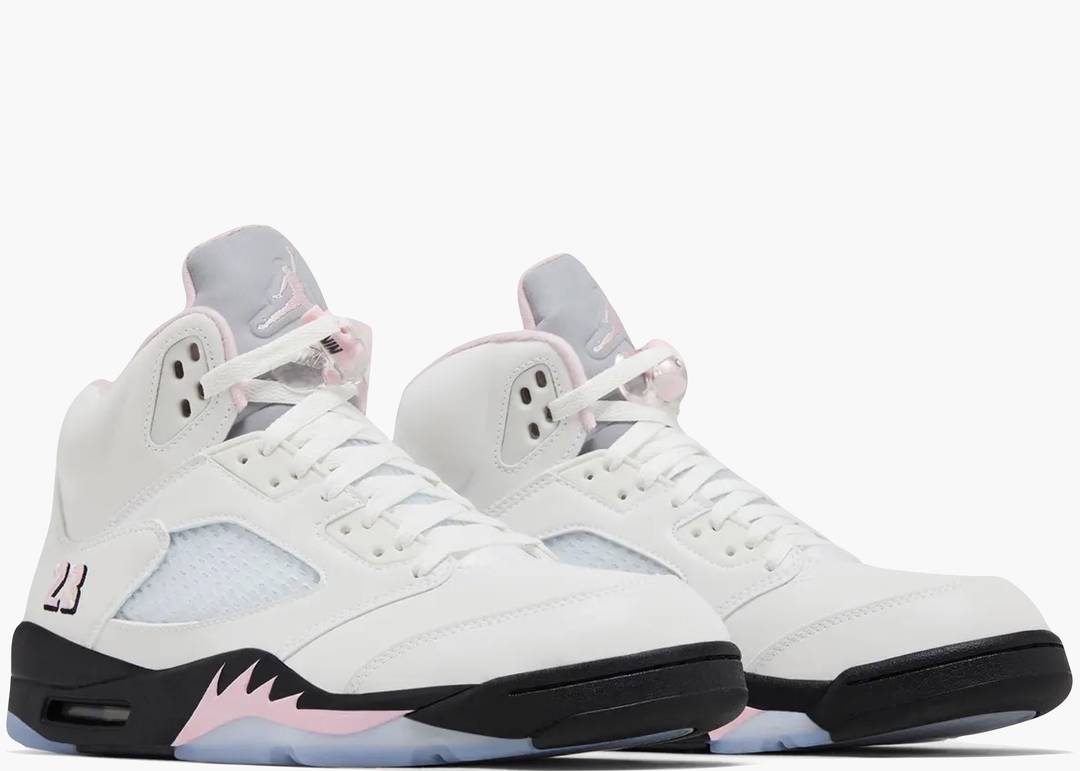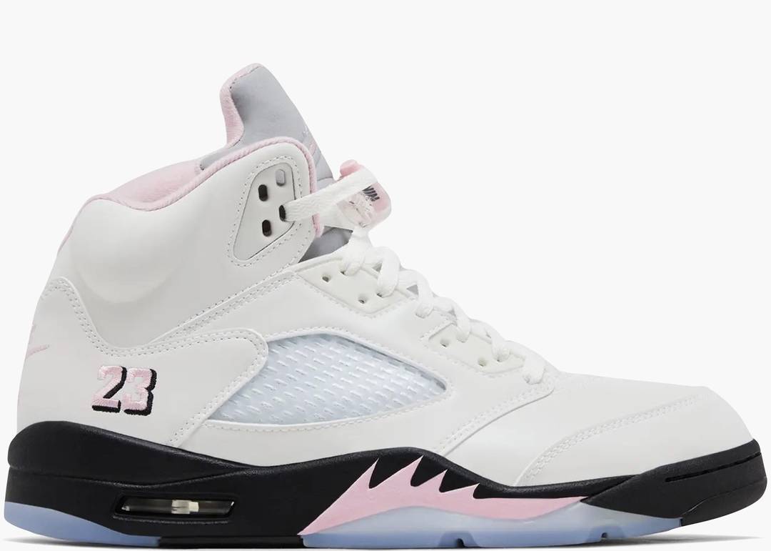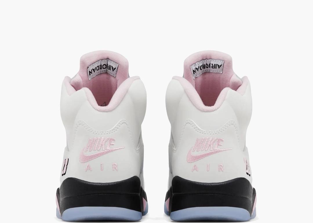 La Jordan 5 Medium Soft Pink abbina una tomaia in pelle bianca di alta qualità a dettagli rosa tenue che arricchiscono l’iconico design a dente di squalo sull’intersuola e il ricamo ‘23’ laterale. Il rosa continua sulla fodera interna, sul logo Jumpman in linguetta e sul marchio Nike Air sul tallone, creando un equilibrio cromatico raffinato. La finitura riflettente 3M e la suola traslucida color ghiaccio completano questa sneaker dal look elegante e distintivo.