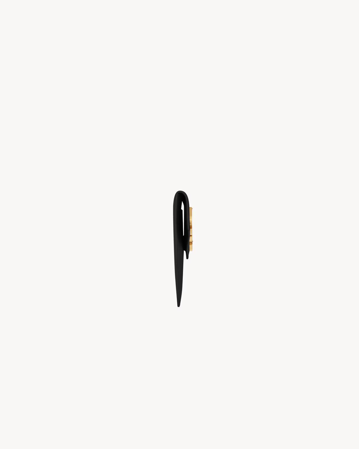 La silhouette essenziale e compatta è impreziosita dal celebre logo YSL in metallo dorato, simbolo di eleganza senza tempo. La chiusura a patta con bottone magnetico nasconde un interno foderato ideale per custodire l’essenziale, rendendo questa clutch perfetta sia per il giorno che per la sera.