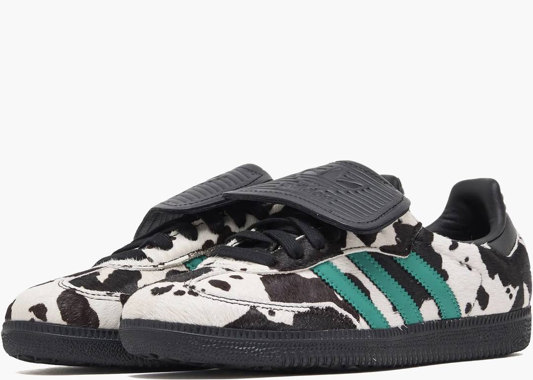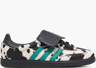 L’Adidas Samba LT Cow Print Black White (W) si distingue per la sua tomaia interamente decorata con una stampa cow print bianca e nera, che conferisce un look audace e contemporaneo. Il ritorno della linguetta ispirata alle scarpe da calcio riprende le radici sportive del modello, mentre la suola nera completa il design con un tocco di contrasto. Questa sneaker unisce stile distintivo e elementi classici, ideale per chi cerca originalità senza rinunciare alla tradizione.