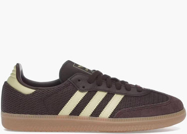 Le Adidas Samba OG Shadow Brown Powder Yellow da donna celebrano la tradizione calcistica degli anni ’50 con un design autentico e attuale. La tomaia in mesh, arricchita da rinforzi in pelle scamosciata, preserva l’essenza storica del modello. Le iconiche tre strisce dentate e la punta a forma di T enfatizzano la silhouette classica, mentre la suola gum completa un look che unisce heritage e stile contemporaneo, perfetto per appassionate di sport e moda.