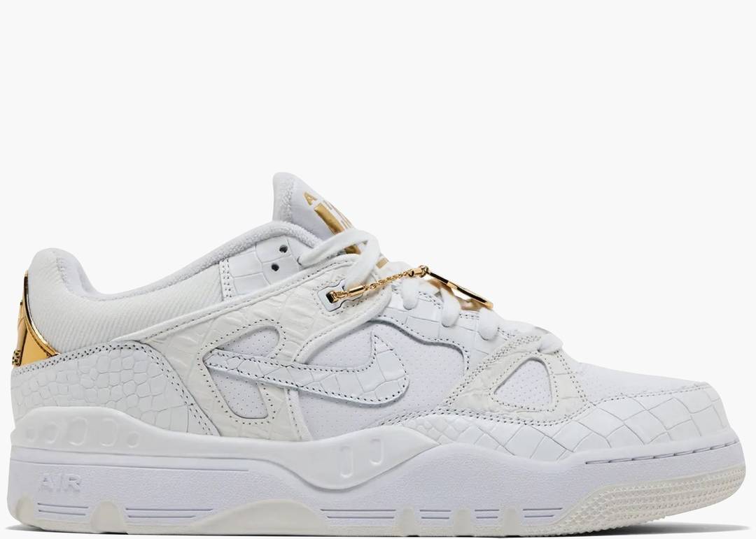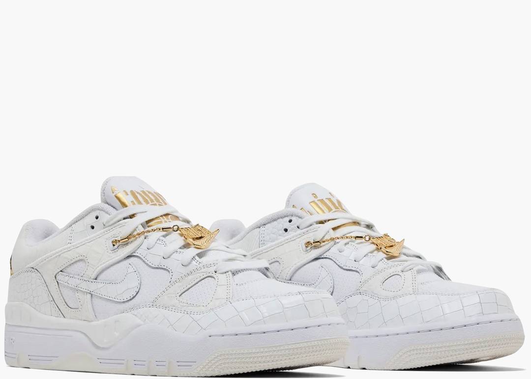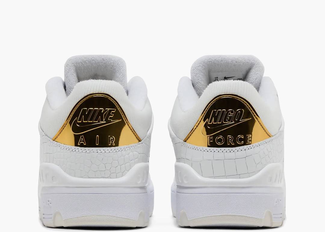La Nike Air Force 3 Low SP White Metallic Gold, frutto della collaborazione con l'icona dello streetwear giapponese NIGO, si distingue per la tomaia in pelle di coccodrillo bianca dalla texture raffinata. I dettagli dorati, tra cui il logo sulla linguetta, le catene in corda che richiamano i loghi Nike e NIGO, e le linguette sul tallone, donano un’eleganza esclusiva a questa sneaker che fonde lusso e stile urbano.