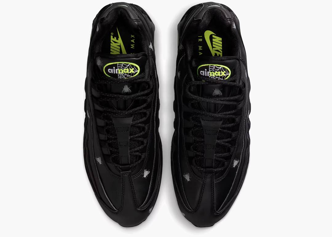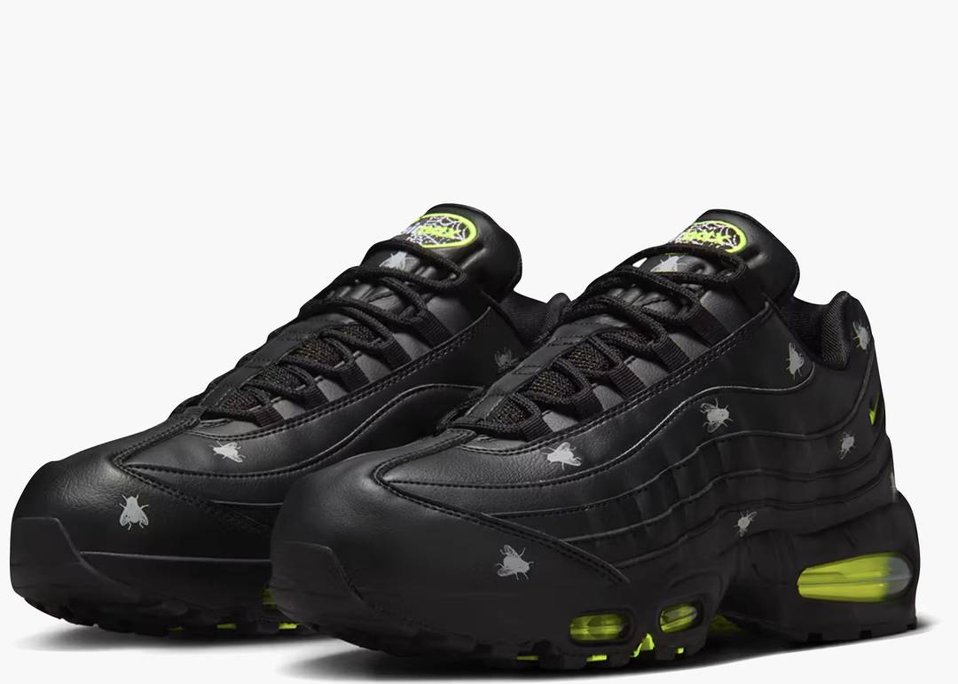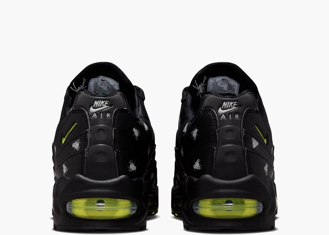 La Nike Air Max 95 Premium Houseflies combina una tomaia in pelle nera con dettagli riflettenti 3M che enfatizzano le sovrapposizioni. Gli accenti verde volt su unità Air, Swoosh e logo linguetta donano un tocco vivace a questo modello dall’anima dark. La suola traslucida con grafica a forma di insetto completa il design, creando un’estetica spettrale ideale per chi cerca un look originale e stagionale.