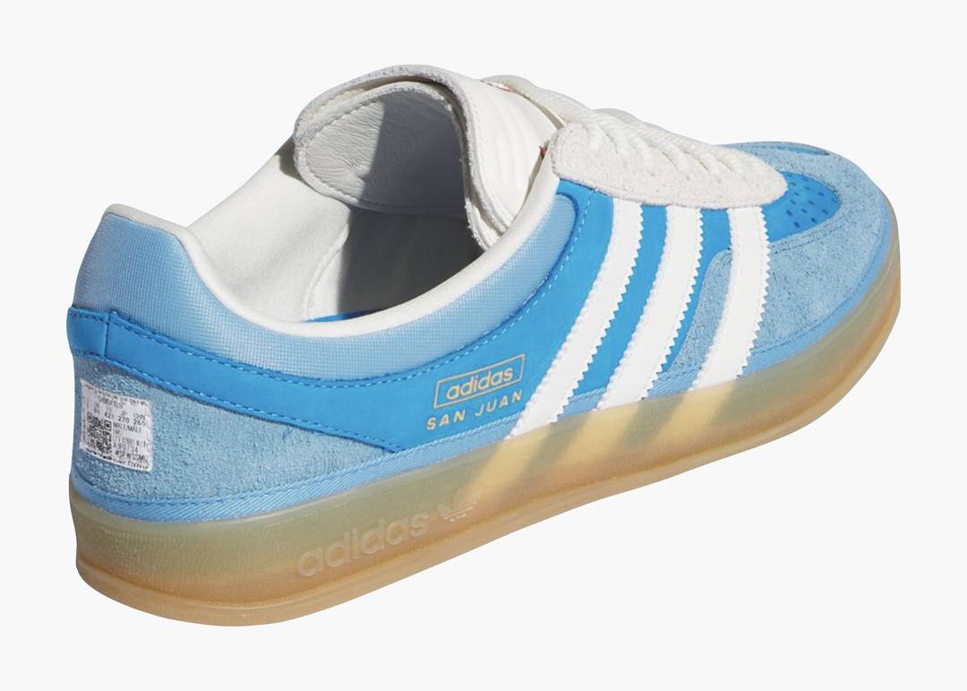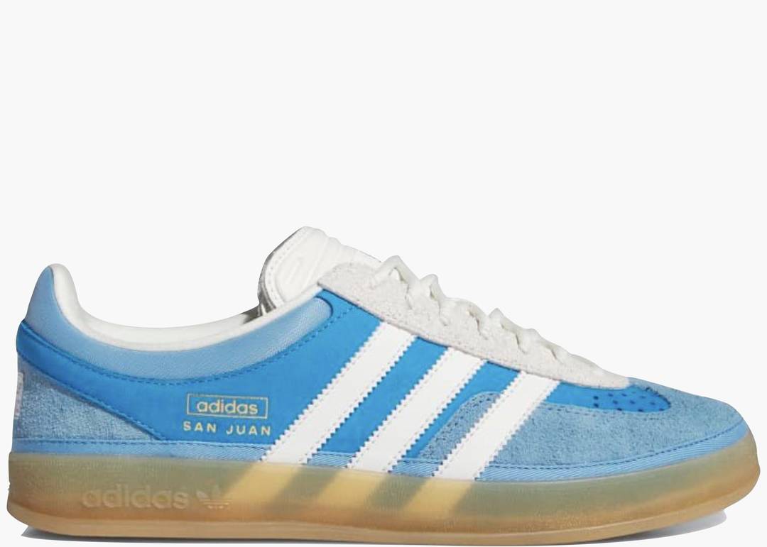 La Gazelle Indoor Bad Bunny San Juan di Adidas è l'esclusiva collaborazione con la città di San Juan in Porto Rico. La tomaia blu celeste rappresenta la costa, il bianco simboleggia la purezza, mentre la suola gum offre comfort e stabilità. Doppia linguetta, punta traforata e marchio "San Juan" caratterizzano il modello.