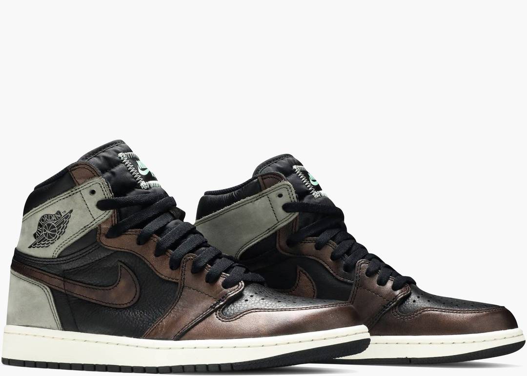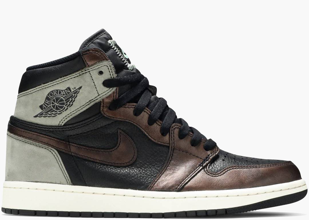 L'Air Jordan 1 Retro High Patina è la versione vintage del classico Jordan 1, con dettagli "sbiaditi" che conferiscono un aspetto invecchiato alla pelle nera. Il tallone e il colletto in nabuk grigio e l'intersuola bianco sporco aumentano l'effetto retrò. La linguetta con l'etichetta nera e il logo "Nike Air" in verde menta completano il look iconico.