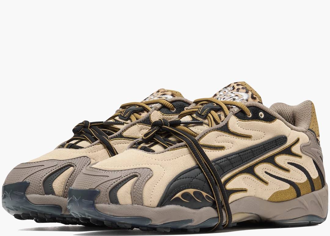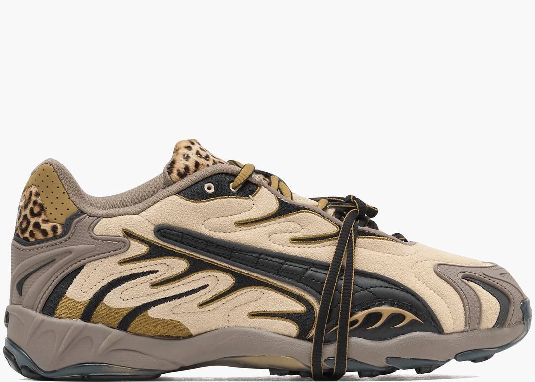 Le Puma Inhale A$AP Rocky Leopard uniscono dettagli audaci e design contemporaneo, grazie a sovrapposizioni in suede marrone chiaro e pannelli neri con motivi a fiamma. Le finiture leopardate in bianco e nero su tallone e linguetta aggiungono un tocco distintivo, mentre i lacci extra offrono versatilità nello stile, permettendo a chi le indossa di personalizzare ogni outfit con carattere e originalità.