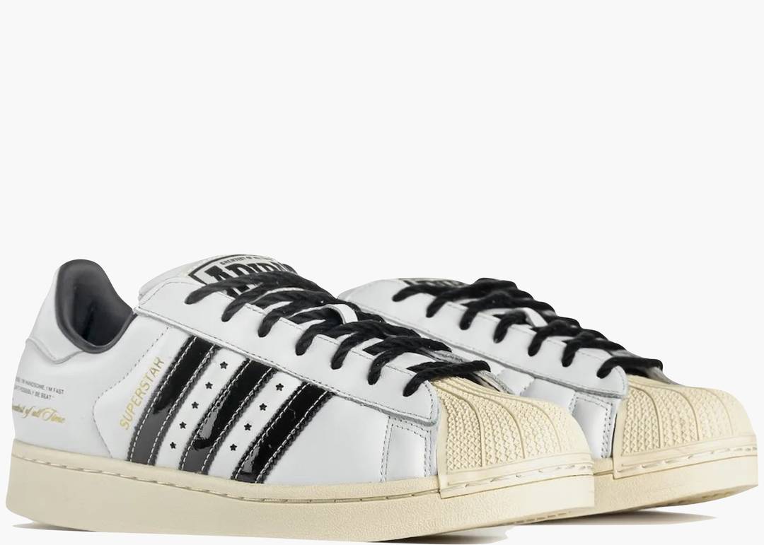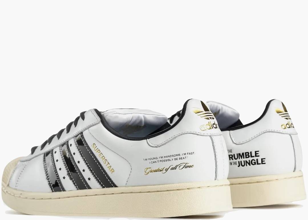Adidas Superstar Muhammad Ali: un omaggio senza compromessi a una leggenda dello sport e della cultura globale. Questa collezione trasforma la silhouette iconica in una narrazione visiva che celebra i momenti più memorabili di Ali. Due varianti cromatiche distinte: pelle bianca con dettagli neri, oppure sfumature di marrone completate da suole color crema dall'estetica vintage che conferisce autenticità al design. I riferimenti ai combattimenti storici "Rumble in the Jungle" e "Thrilla in Manila" incisi sui talloni collegano immediatamente la sneaker al patrimonio pugilistico, mentre la scritta dorata "Greatest of All Time" suggella l'eredità di Ali con raffinatezza. Un capolavoro che unisce heritage sportivo e sensibilità contemporanea, destinato a chi riconosce il valore della storia indossata ai piedi.