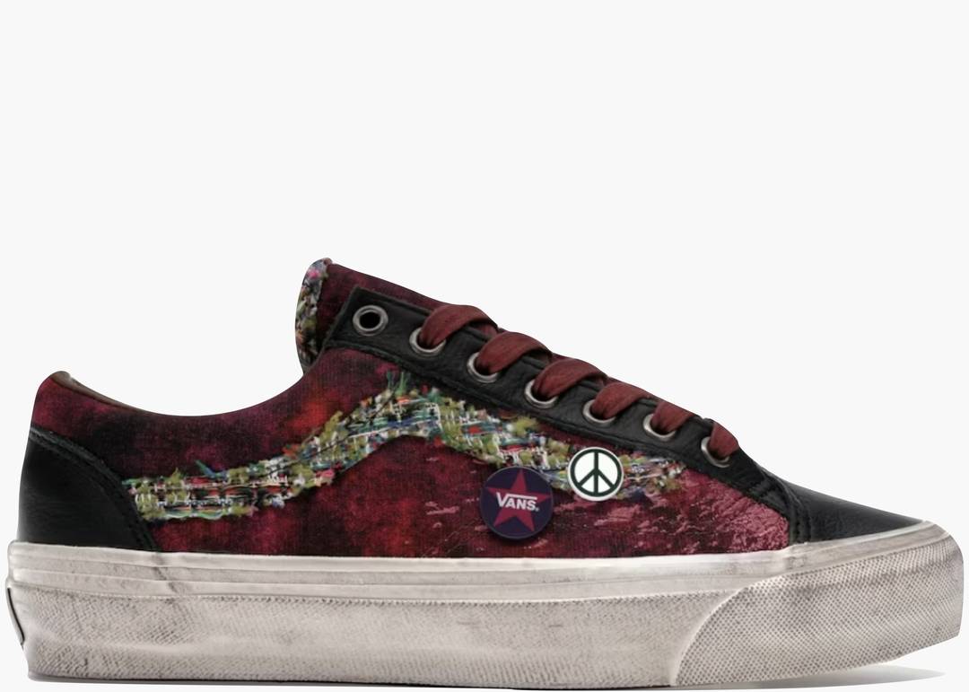 La Vans Old Skool 36 LX Souvenir Burgundy è un tributo sofisticato all'iconografia Chanel, ispirata ai graffiti della collezione Primavera/Estate 2015. La tomaia in tela invecchiata richiama l'estetica heritage del modello originale, mentre le caratteristiche strisce Jazz in tweed multicolore aggiungono un elemento di lusso sartoriale lungo i fianchi. I rivestimenti in pelle nera e le spille tematiche Vans elevano il pezzo a status di collector's item. L'intersuola vintage completamente invecchiata enfatizza l'autenticità del design, creando una sneaker che fonde streetwear e haute couture in un'unica dichiarazione stilistica.