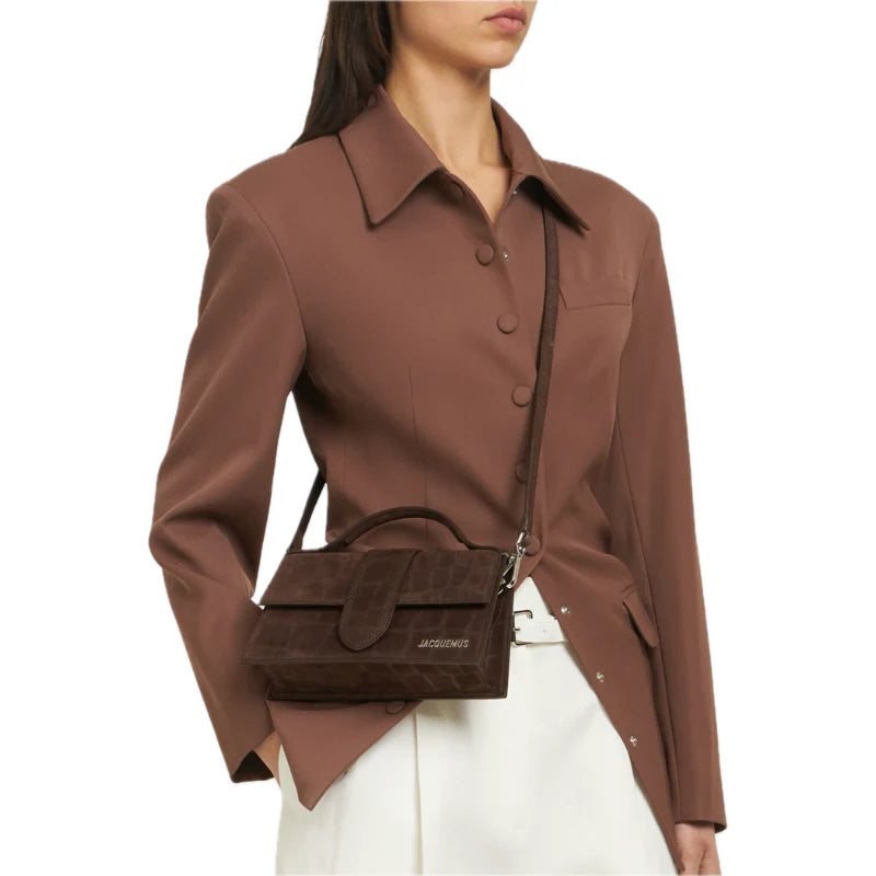 La borsa Le Grand Bambino di Jacquemus in elegante tonalità Dark Brown è l'accessorio perfetto per i look autunnali e invernali. Realizzata in pelle di vitello liscia, questa borsa combina funzionalità e stile con un design minimalista, manico superiore e tracolla regolabile. La sua struttura rigida e il bottone magnetico garantiscono sicurezza ed eleganza.