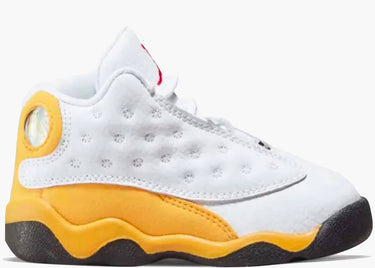La Nike Air Jordan 13 Retro Del Sol (TD) è vestita con una combinazione di colori White, University Red, Del Sol e Black. Questa scarpa presenta pelle bianca su pannelli, punta e linguette con una fodera abbinata. Altri dettagli includono strati esterni in suede giallo (Del Sol), rosso che appare sulla linguetta e suola Jumpman completate da una suola in gomma nera. La versione includerà anche la confezione OG e sarà disponibile nel formato famiglia completo.