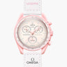 Il Swatch x Omega Bioceramic MoonSwatch Mission to Venus è un modello elegante e femminile della collezione, ispirato al leggendario Speedmaster Moonwatch. Questo orologio combina un delicato colore rosa pastello con un cinturino in velcro bianco. I quadranti secondari hanno una forma ovale con bordi decorati in stile diamante, mentre le lancette rosa per ore, minuti, secondi e cronografo aggiungono raffinatezza. Presenta il logo congiunto OMEGA X SWATCH e il caratteristico “punto sopra il 90” sulla lunetta. Il trattamento Superluminova assicura la visibilità al buio, e la “S nascosta” sul vetro completa i dettagli curati di questo orologio in Bioceramic.